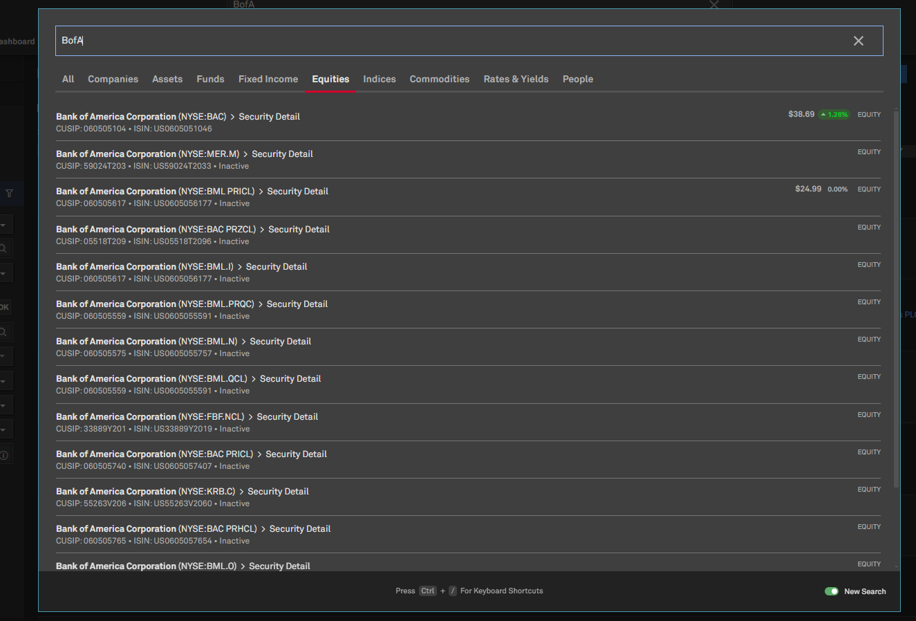 Type a keyword (e.g., BofA, a synonymous term for Bank of America) to see relevant results for fixed income, equities, and transactions.