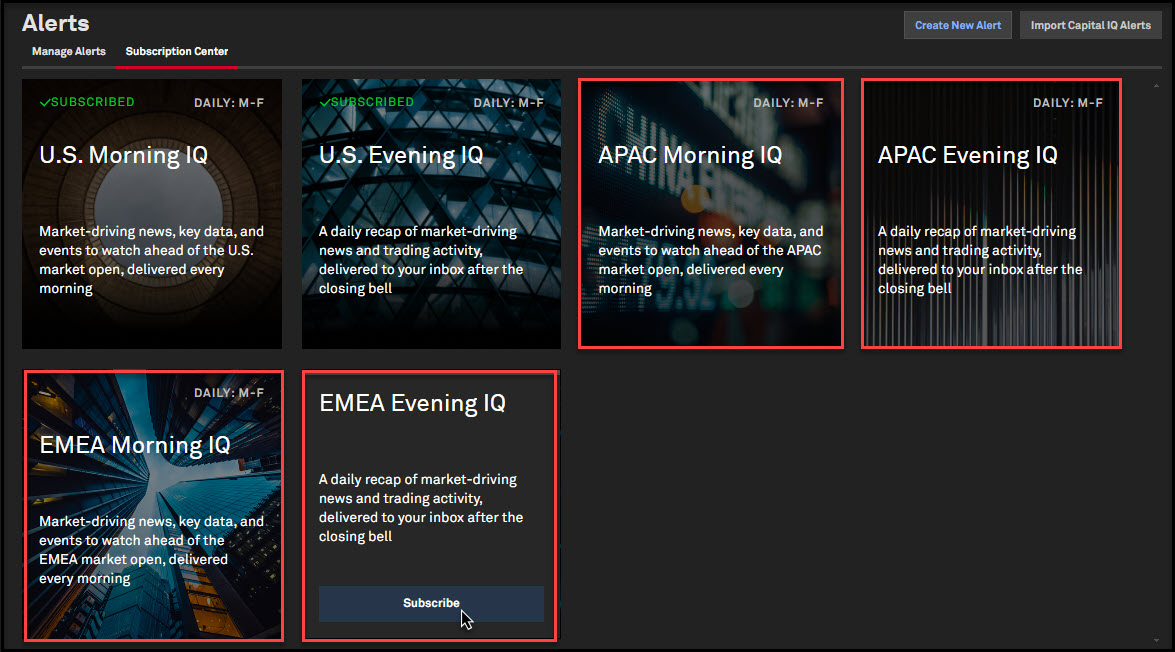 Users can now subscribe to the EMEA and APAC Regional Morning and Evening IQ newsletters, which provide daily customized market insights and supplementary data, similar to our US market newsletters.