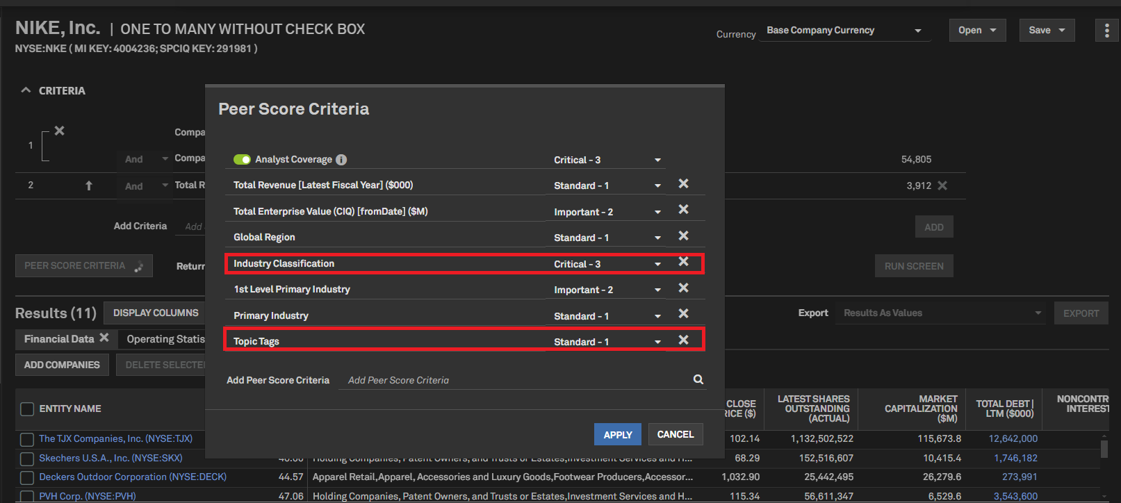 Users can now score Peer Comps using Topic Tags and secondary industries. Peer candidates will be evaluated based on the number of values matching the focus company. Topic Tags and secondary industry are included as Peer Score criteria by default for public companies with market capitalization exceeding $25 billion.