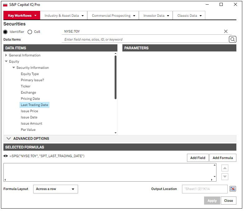 Use a company ID, Exchange:Ticker[Inactive], Exchange:Ticker, ISIN, SEDOL, or CUSIP to retrieve market data or multiples data for inactive securities and historical companies. E.g. Formula =SPG(“NYSE:TOY[INACTIVE],”SP_PRICE_CLOSE”, “5/8/2001”)