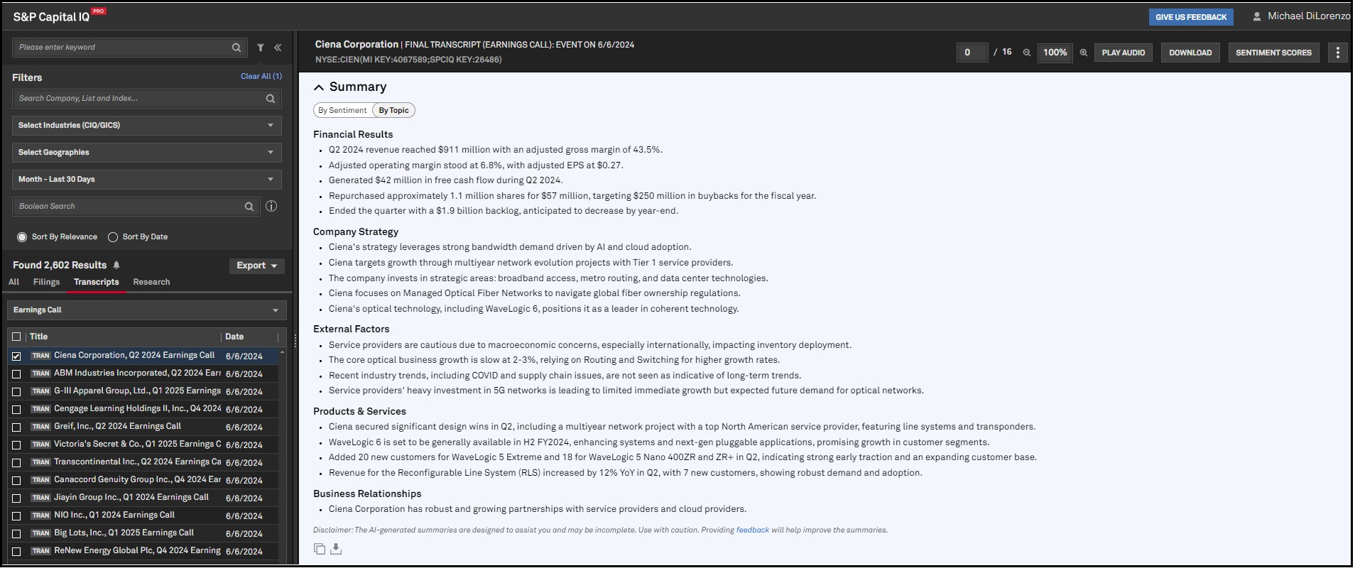 With the advent of Generative AI, we continue to build on our AI-driven enhancements across the platform in partnership with Kensho and our data science teams. In this release, we are introducing Generative AI Transcript Summarization, which provides a summary of earnings call transcripts that saves time for users and complements our NLP-derived sentiment scores within the AI-powered Document Viewer. These new transcript summaries are organized by Topics and Sentiment, offering users a comprehensive overview of the earnings call. Summaries are available for global earnings call transcripts from January 1, 2023 onward.