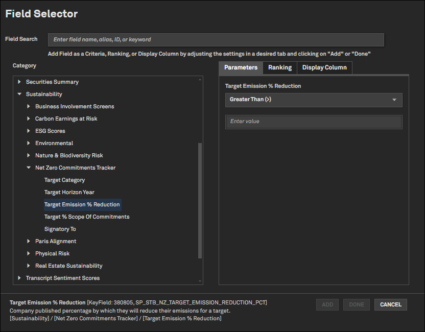 Go to Field Selector and expand Sustainability > Net Zero Commitments Tracker folder