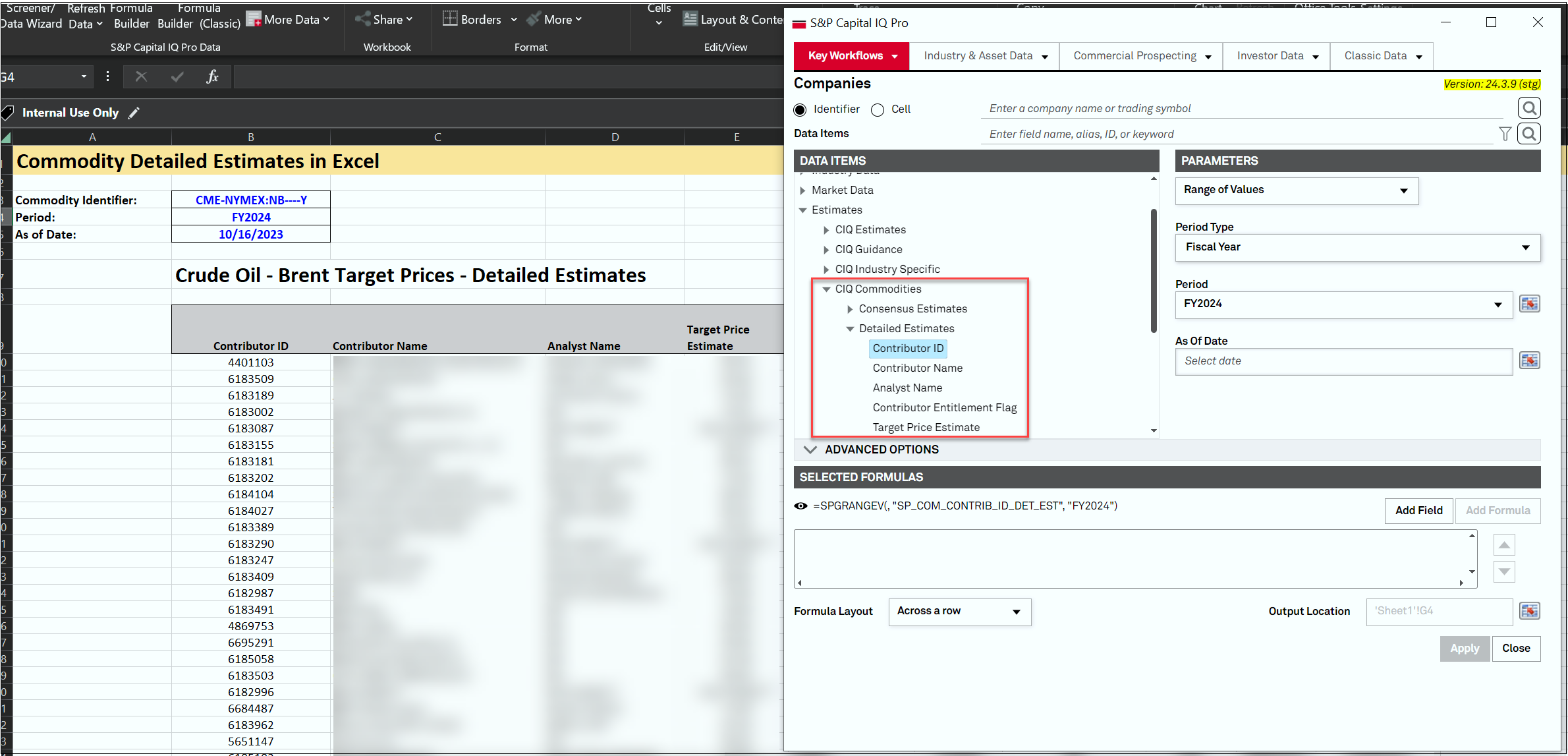 Click Add Formula and Apply to pull the list of contributors and their FY2024 target price estimates for Gold as range formulas in Excel