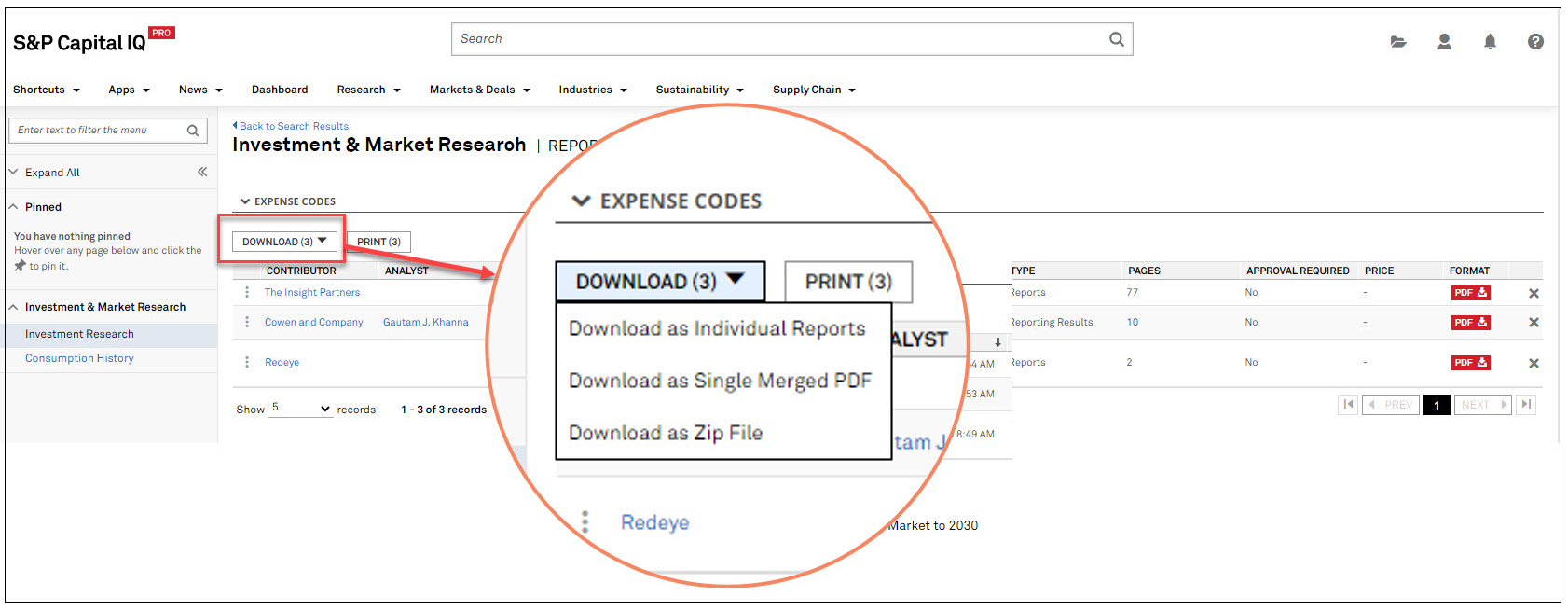 Users can download and print Investment Research reports directly from the Report Preview page using action buttons located above the search grid, enhancing the overall user experience.