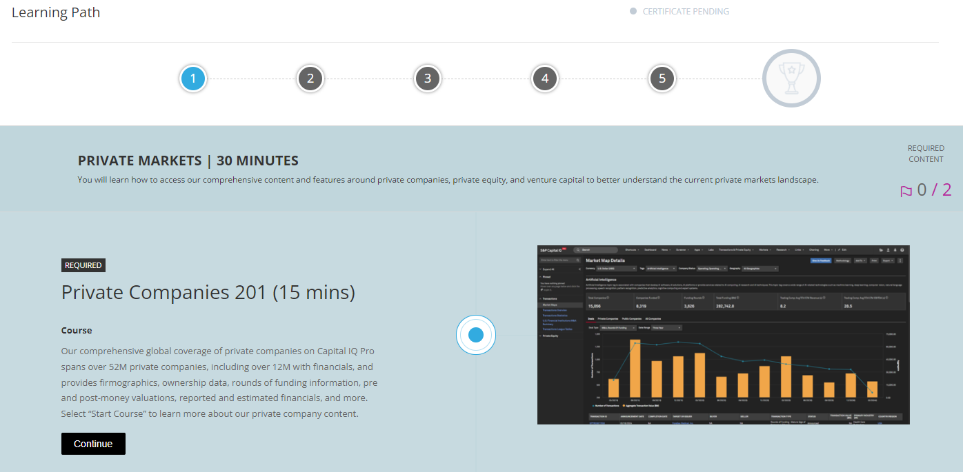 Users can access the new Capital IQ Pro 201 courses to learn more about advanced Capital IQ Pro platform and Office Plug-in capabilities including Peer Comps, Transaction Screening, Private Companies, Find Buyers, Office Tools, and more. Once users complete and pass all ten courses, they are eligible to receive a Capital IQ Pro 201 certification to add to their LinkedIn. The Capital IQ Pro 201 certification adds to the other great courses already available in Capital IQ Pro Academy, including Capital IQ Pro 101, Banking 101, and RatingsDirect 101.