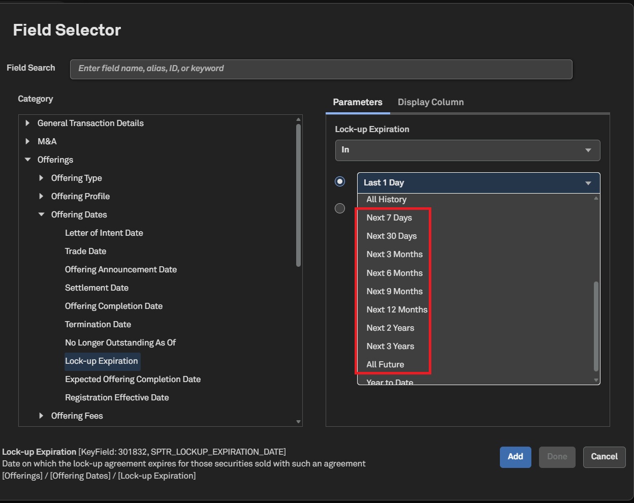 In this release, we added convenient future lookup values across applicable date fields in the Transaction Screener. This makes it easier to set time-based filters without manually entering dates.