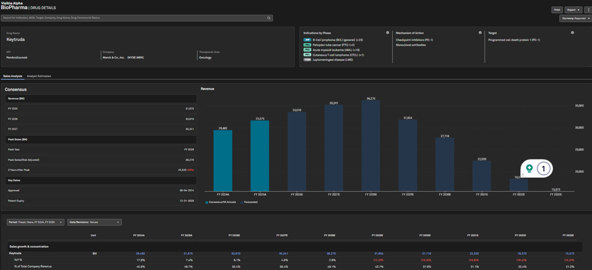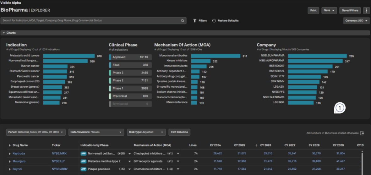 Users can now access Visible Alpha BioPharma on S&P Capital IQ Pro, providing granular, forward-looking consensus estimates for life sciences, biotech, and pharmaceutical industries. This new offering empowers users to analyze drugs and their competitive landscape across drug indications, geographies, therapeutic areas, and mechanisms of action(MOA), supported by the accuracy of Visible Alpha’s consensus data. With enhanced visibility into market expectations and underlying assumptions, Visible Alpha BioPharma enables improved forecasting and modeling for commercial viability of the BioPharma products.
