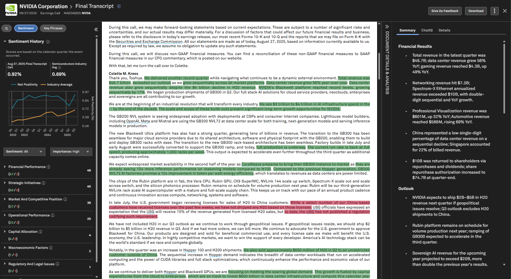 This enhancement enables equity and credit analysts, corporate development teams, and anyone in roles that involve transcript-heavy reviews to quickly identify meaningful changes in tone and messaging, minimize time spent reading full transcripts, and focus on issues most relevant to valuation and risk decisions.