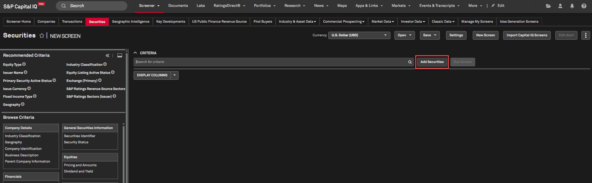 Users can use the ‘Add Securities’ feature in the Securities dataset within Screener to add companies, funds, equity or fixed income securities, company portfolios, and securities lists that were previously created in the Securities dataset in Screener.