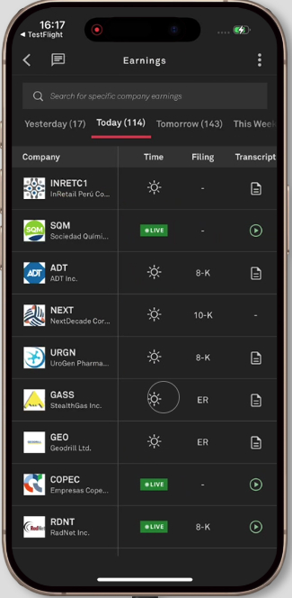 Users can access a new badge that indicates when a real-time transcript is being generated for an earnings event. Tap the live play button in the earnings widget, calendar, or company profile to view real-time transcript updates during calls.