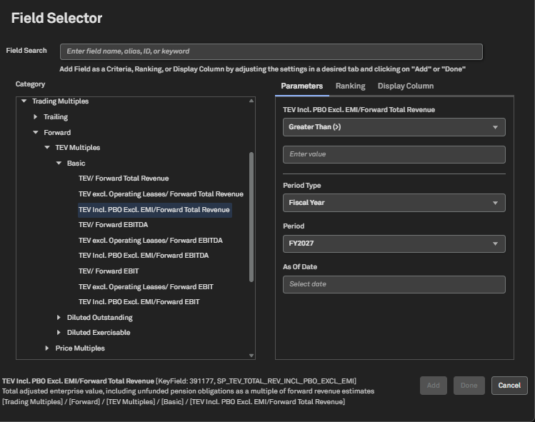 Under Data Items, select Financials >Trading multiples > Trading > CIQ Trading Multiples > TEV Multiples, new TEV options are added to the trailing and forward TEV multiples folders