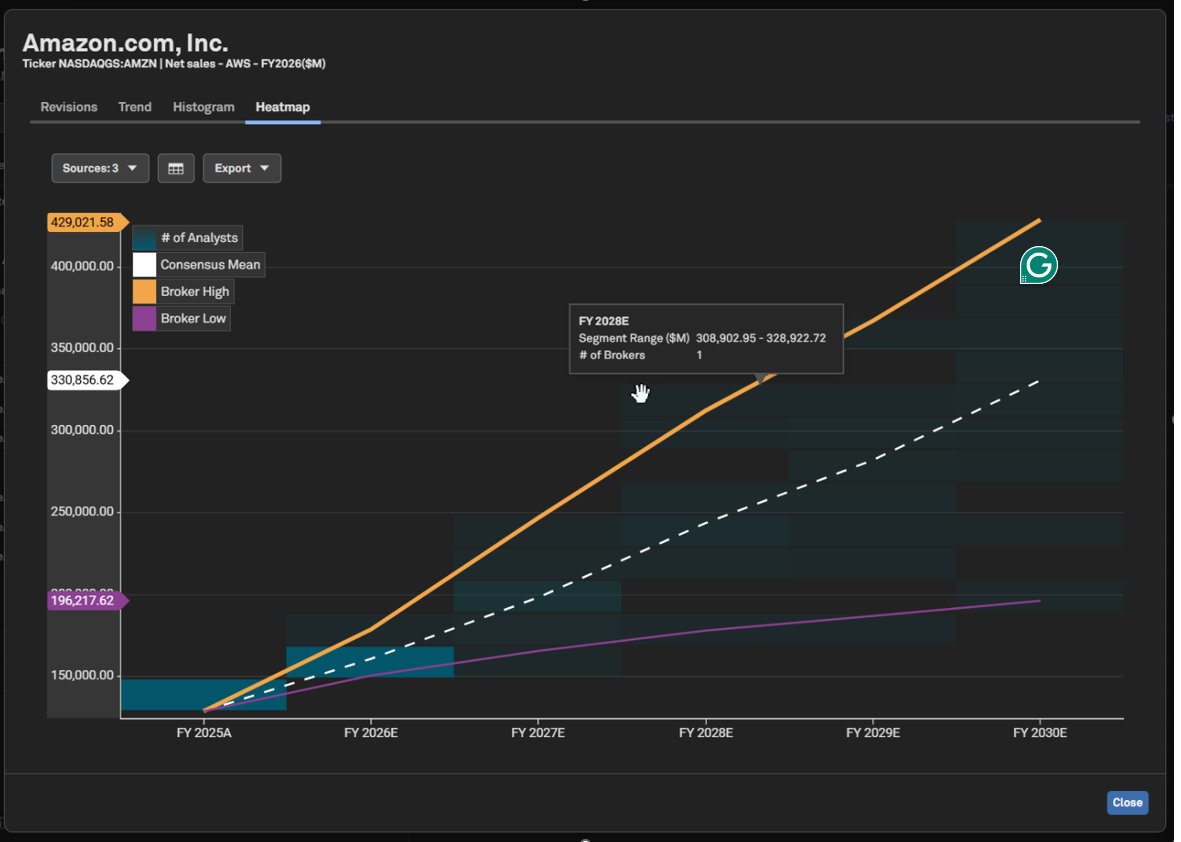 Users can now visualize the distribution of analyst estimates over time with our new Analyst Histogram and Heatmap charts, available via Quick Charting on Visible Alpha pages. Launch a quick chart from any supported datapoint to explore where analysts’ estimates cluster or diverge from consensus across a periodic time series. Users with broker entitlements can also optionally overlay individual broker estimates on these charts.