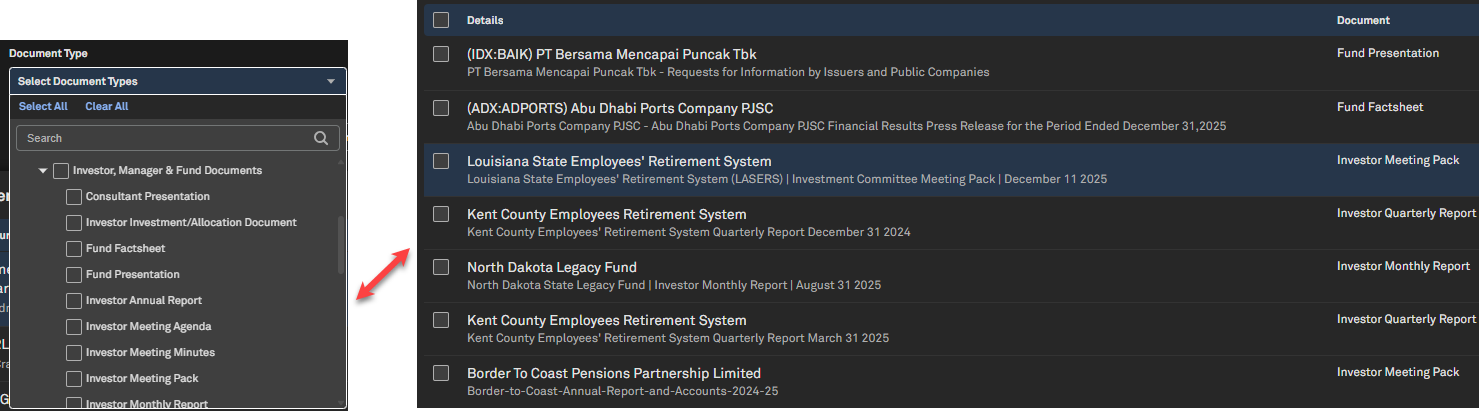 In the Document Type filter, expand Filings > Investor, Manager & Fund Documents and select any document