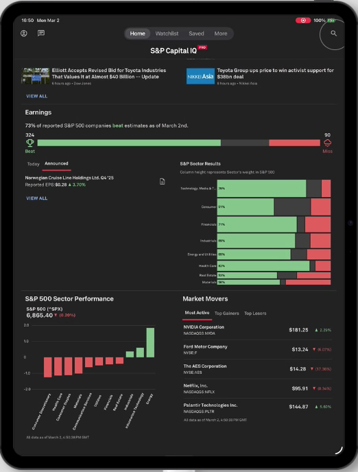Users can now access a dedicated page in the Capital IQ Pro Mobile App and a widget on their tablet, showcasing sector-level earnings misses and beats. This feature helps to easily track trends across S&P 500 sectors throughout the earnings season.