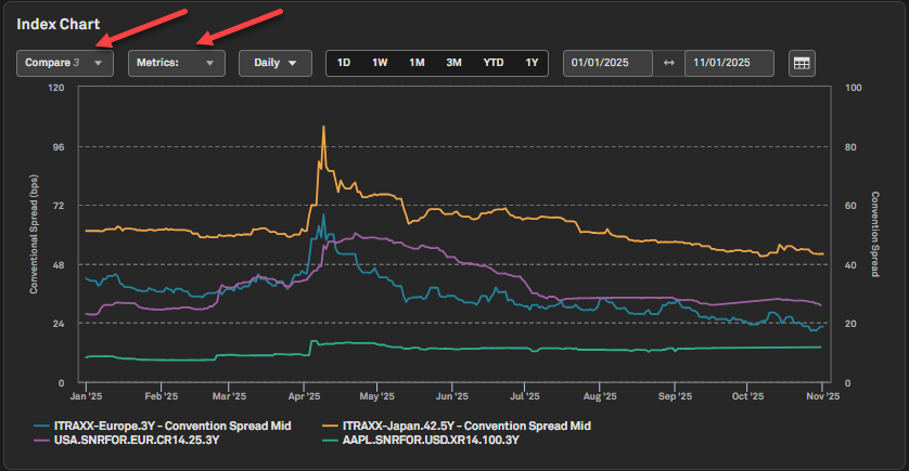 In this release, we enhanced the CDS chart on our Credit Default Swaps (CDS) page to support comparisons of issuer-level CDS with equities, indices and country-level CDS. We also updated Report Builder functionality to include the new CDS fields.